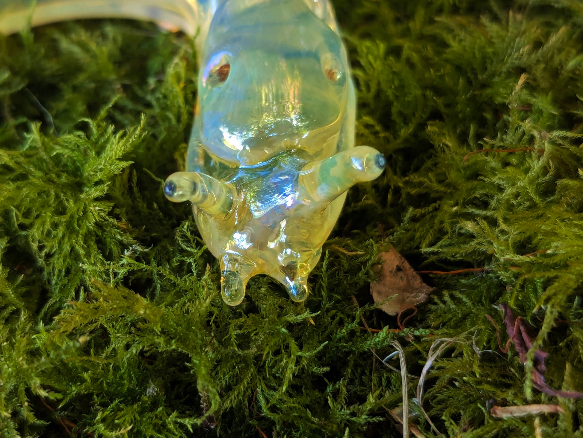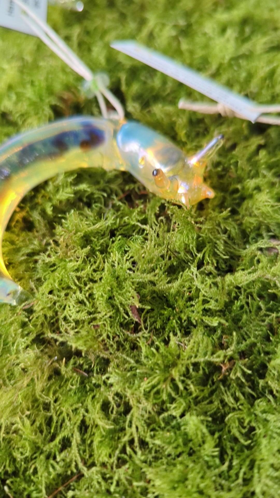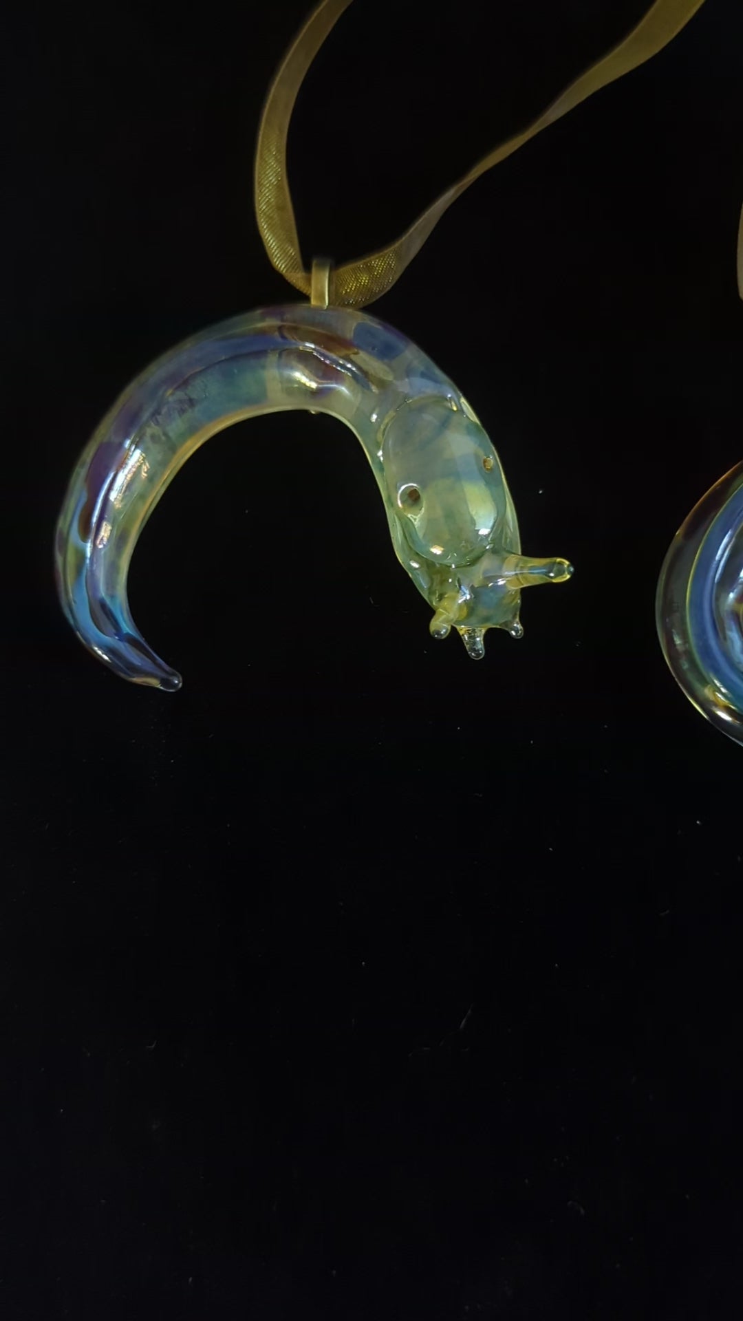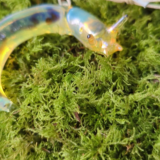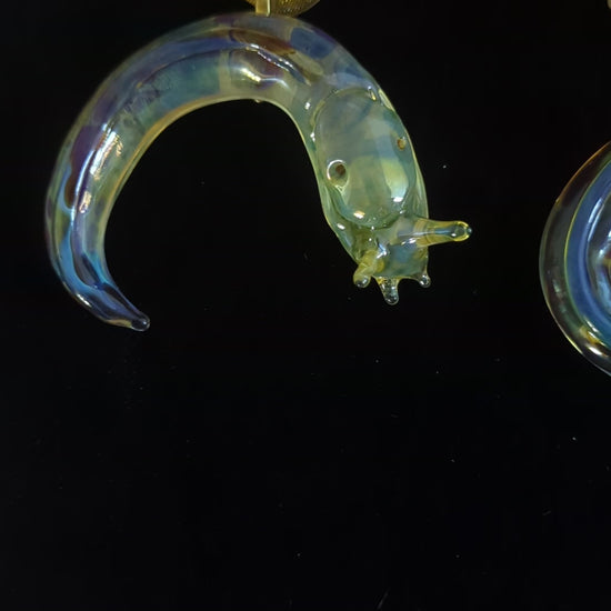 This detailed glass banana slug sculpture/ornament was lovingly hand made in our small family studio on the coast of Northern California. It's made with a more durable type of glass called borosilicate (the type used in scientific applications, and that Pyrex used to be made of). It has also been kiln annealed to increase its strength. The yellow coloring was created by vaporizing a piece of silver, and using that vapor to coat the glass, giving it a yellow iridescence. I'm making these as christmas ornaments, but they make nice suncatchers too!
