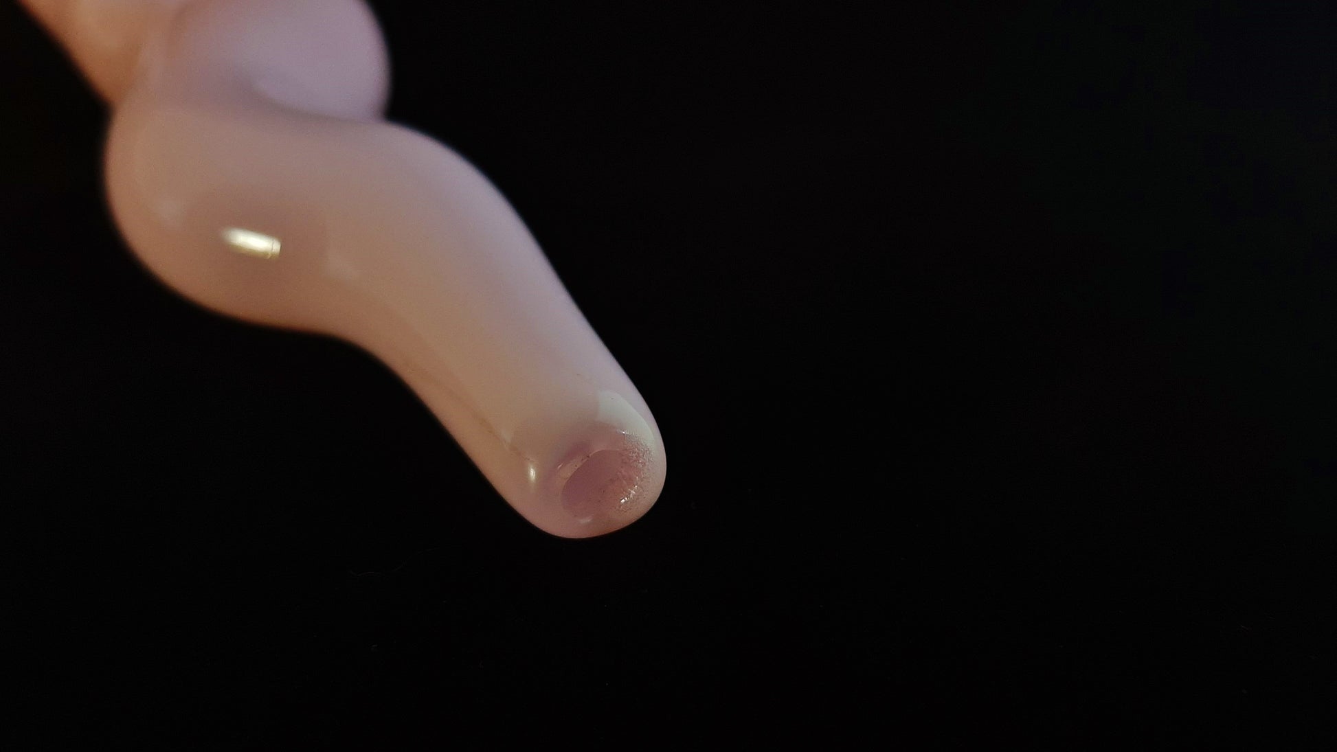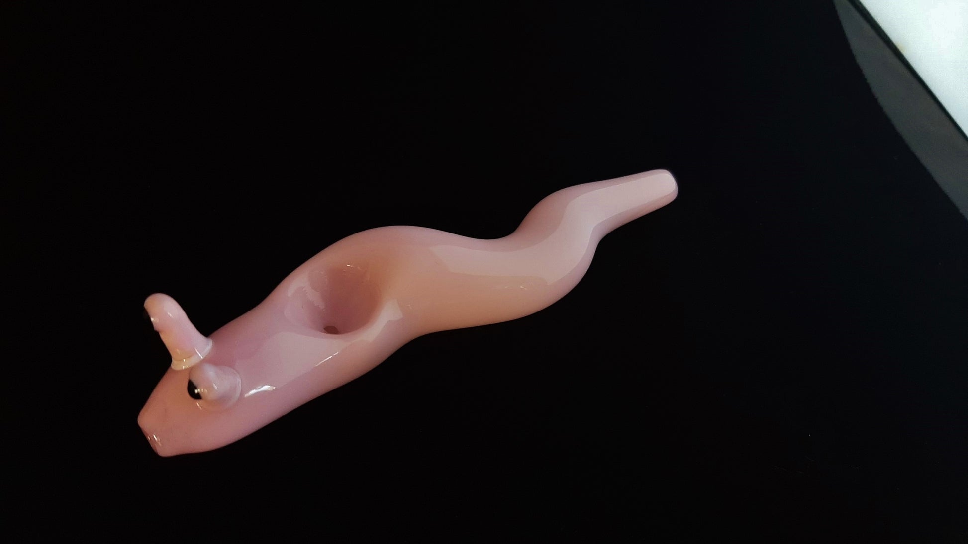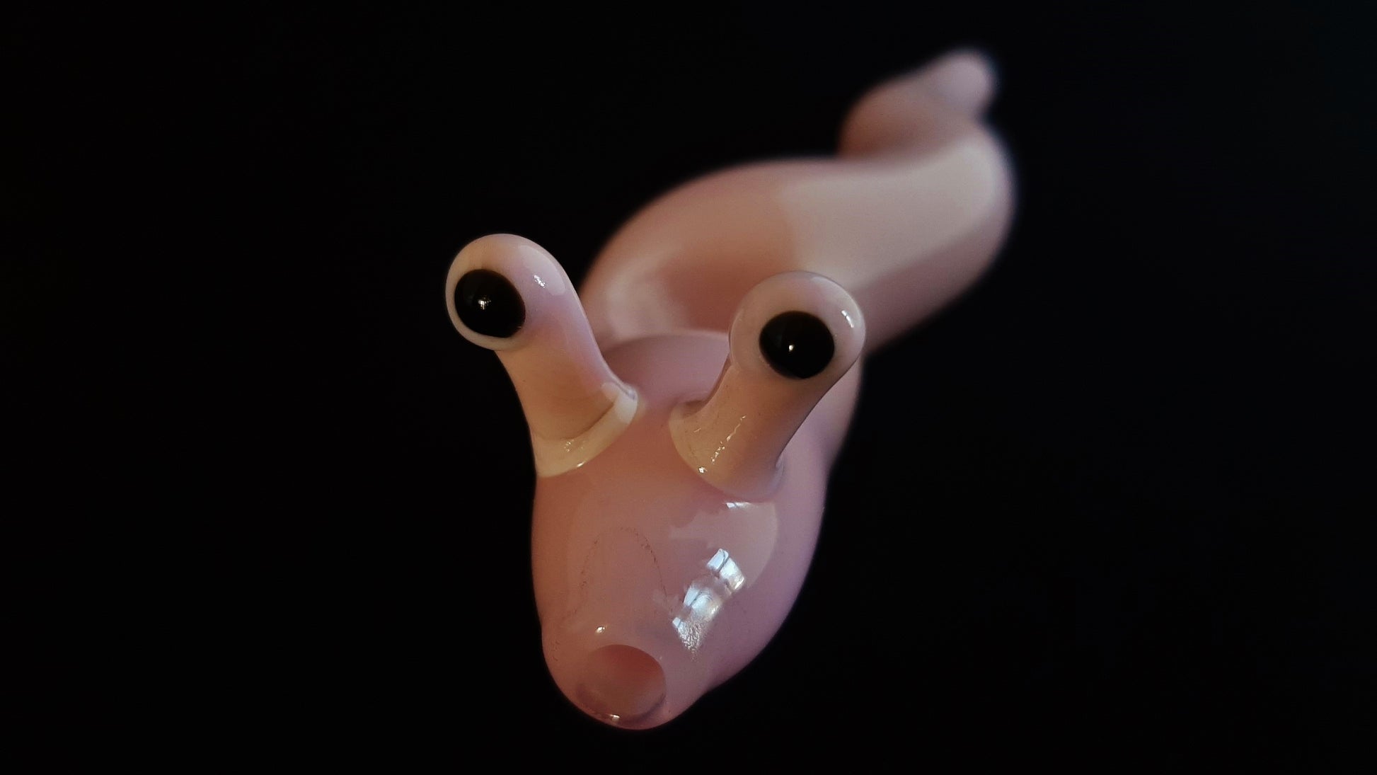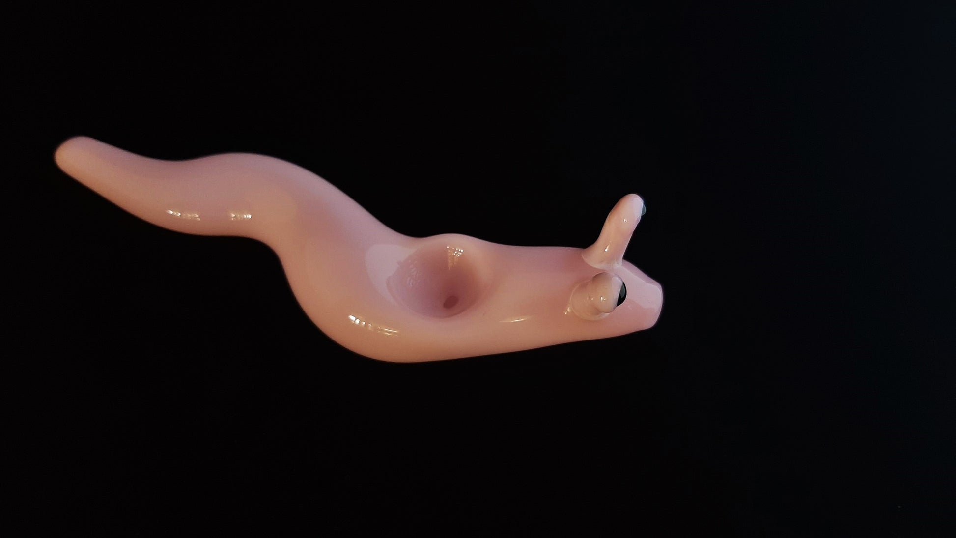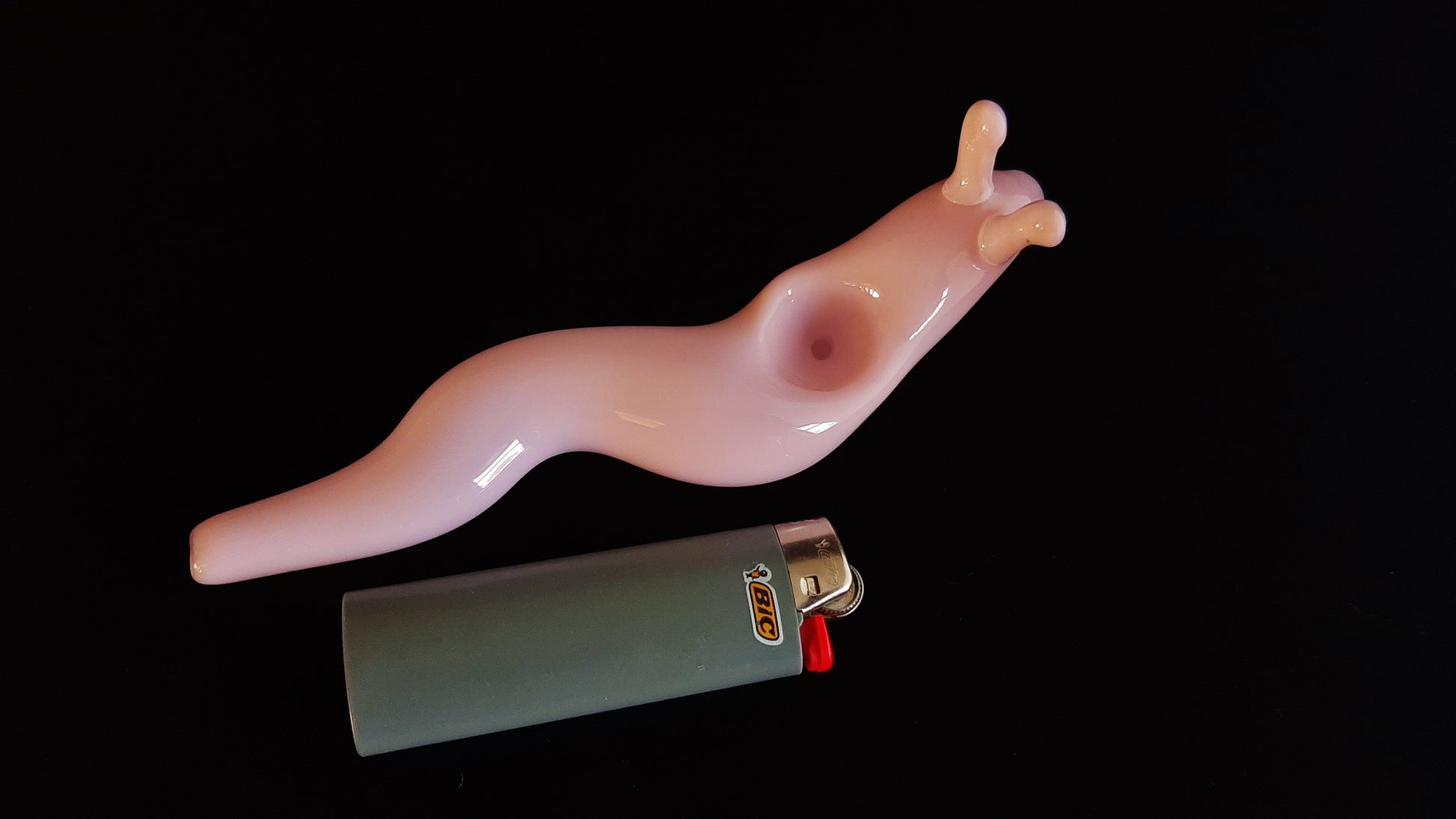 This beautiful glass slug has been carefully sculpted with many details. The graceful curves give the impression that it is slowly slithering along. The bottom is flattened slightly (as with a real slug), making it very stable. It was made with pink colored borosilicate glass. The lighter in the last photo is a standard sized Bic.