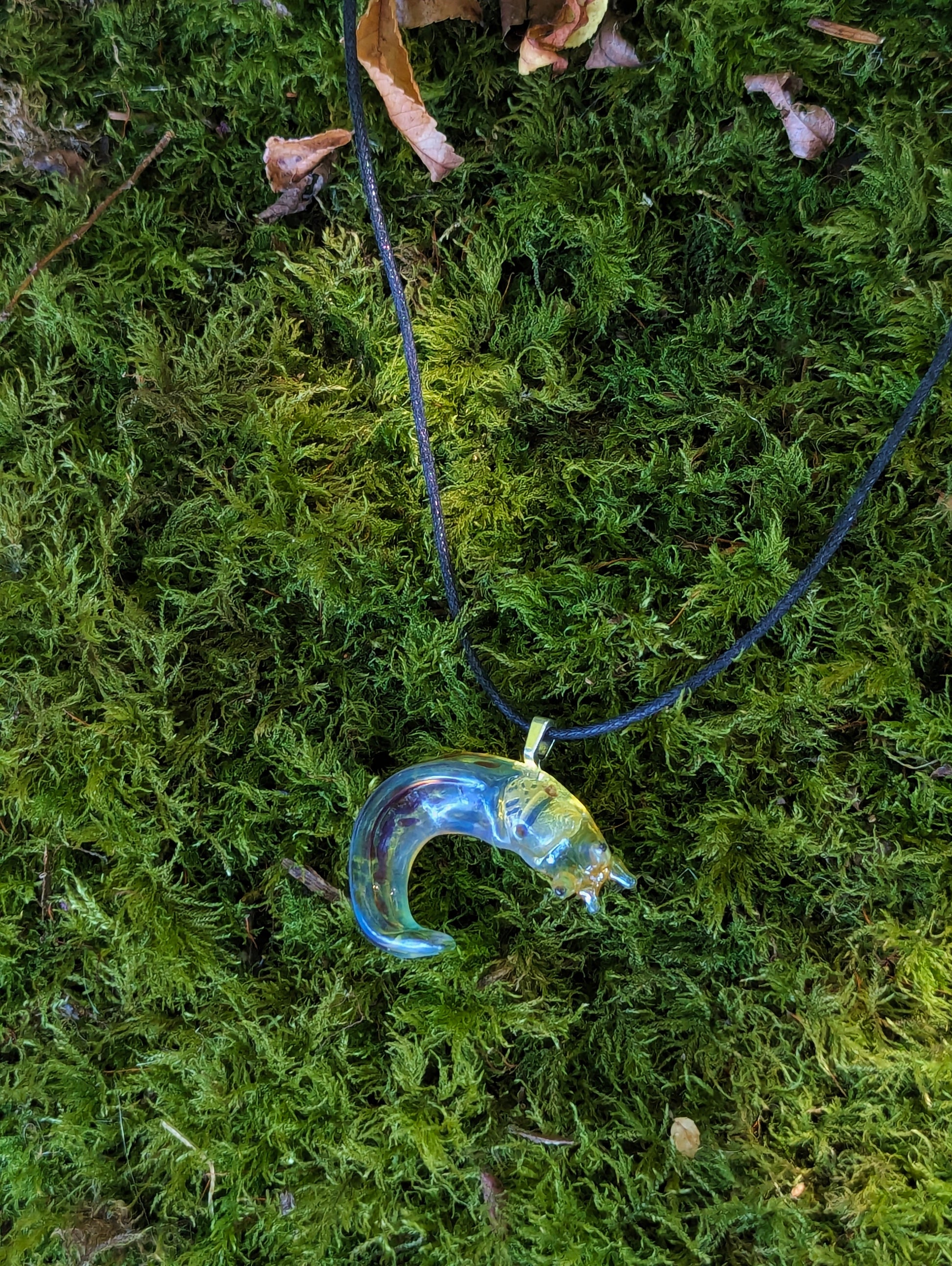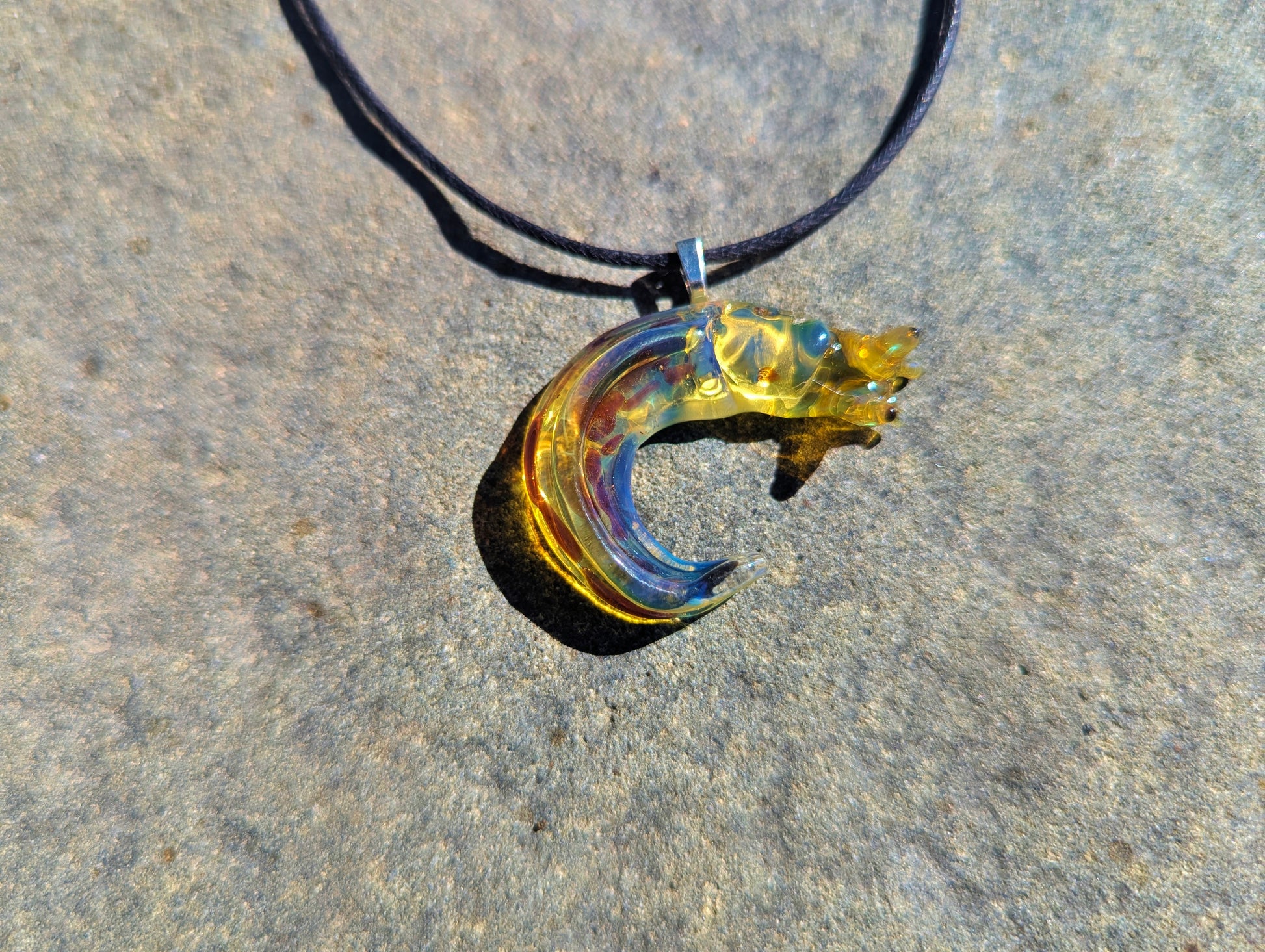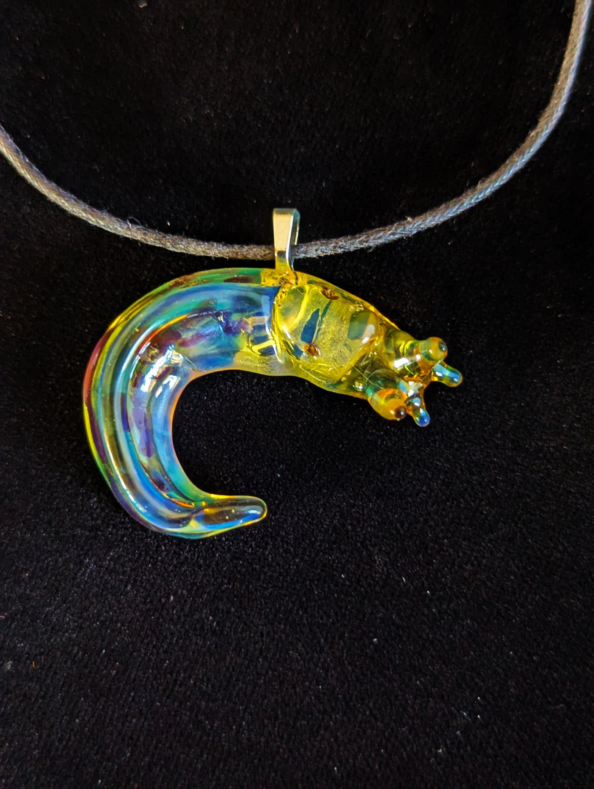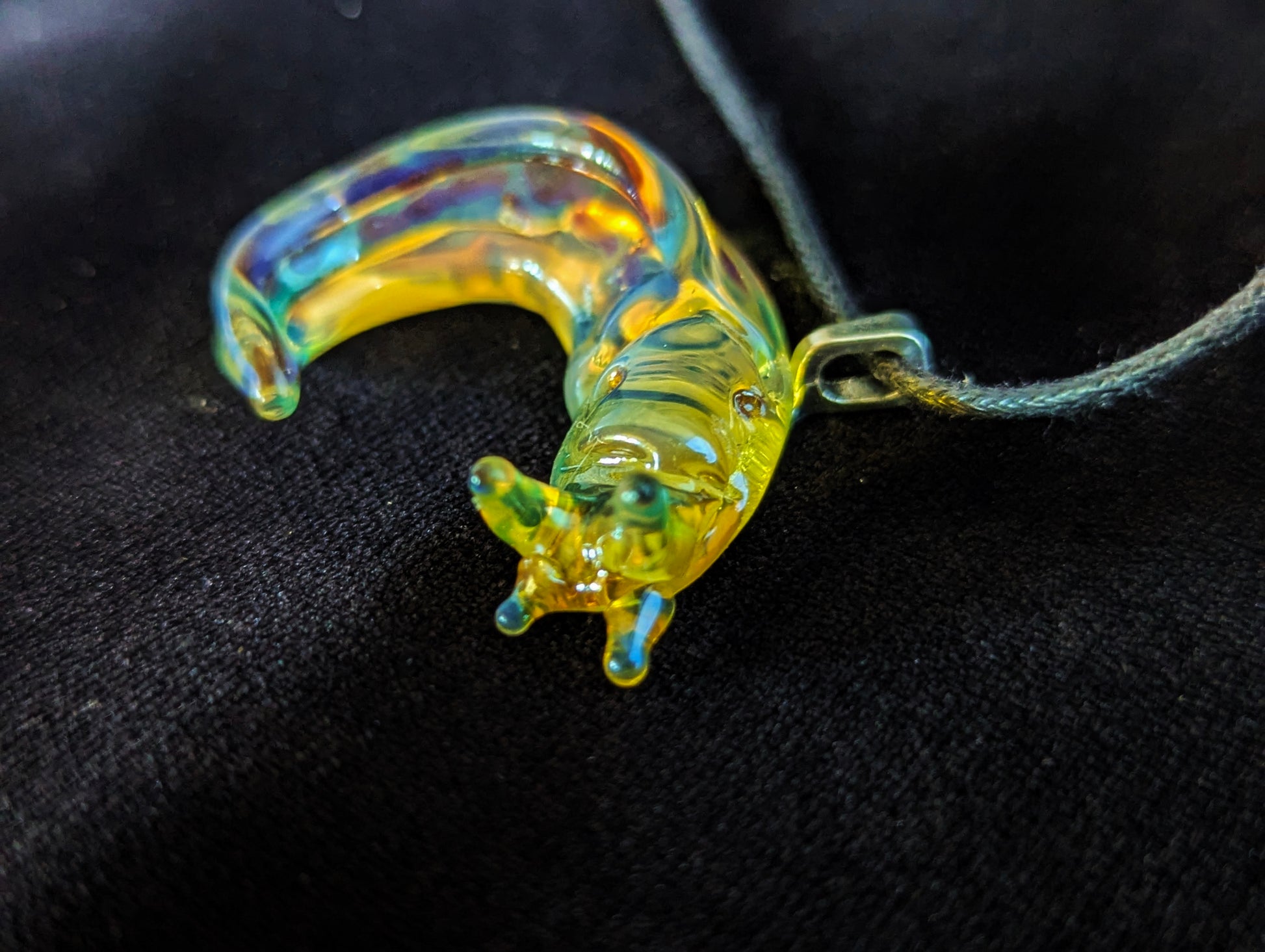 This detailed banana slug pendant was meticulously hand made in our small family studio in Northern California (in banana slug territory). It is made a much more durable type of glass, called borosilicate. The yellow coloring was created by vaporizing a piece of silver, and using that vapor to coat the glass, giving it a yellow iridescence. It comes with an adjustable waxed linen cord.